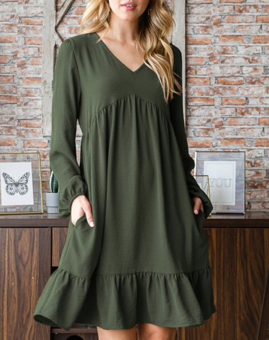Picture This ~ Long Sleeve Babydoll Dress in Olive Green