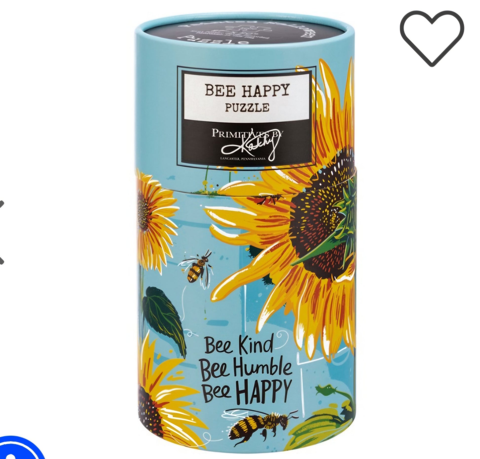 A 1,000 piece puzzle featuring a hand lettered "Bee Kind Bee Humble Bee Happy" sentiment with bee and sunflower designs. Puzzle pieces are packaged in a resealable plastic bag and enclosed in a cylindrical box with a full wrap-around design and a descriptive "Bee Happy Puzzle" sentiment on lid. Our Bee Kind Bee Humble Bee Happy puzzle includes a 10" x 8" printout of full puzzle image for reference.
