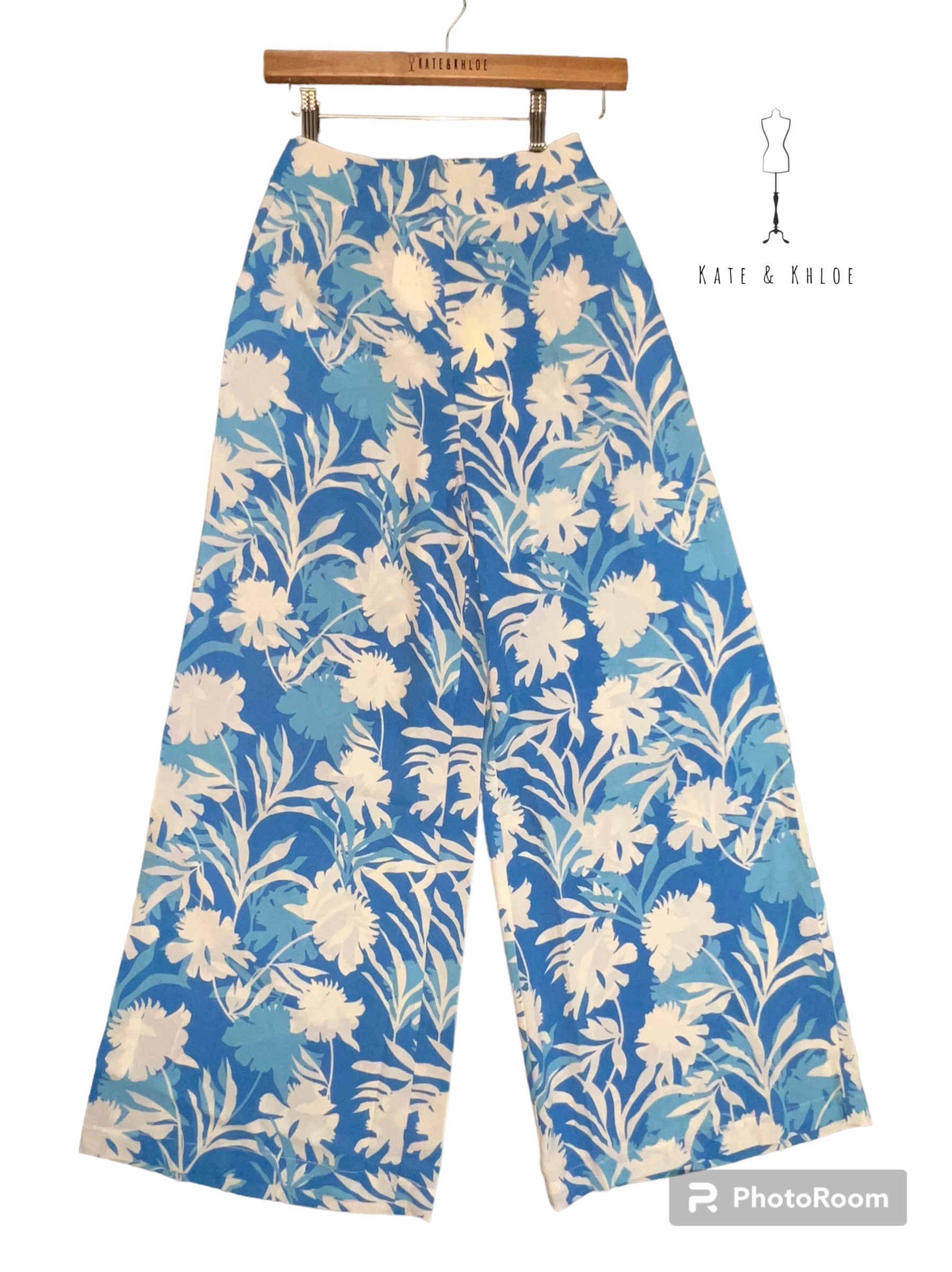 Featuring a vibrant blue color with a beautiful floral print, these pants are eye-catching and feminine. The flared leg design adds a retro-inspired touch, creating a flattering and elongating effect on the legs. They fit true to size. The waist band is stretchy, but the pants do not have give. 100% polyester