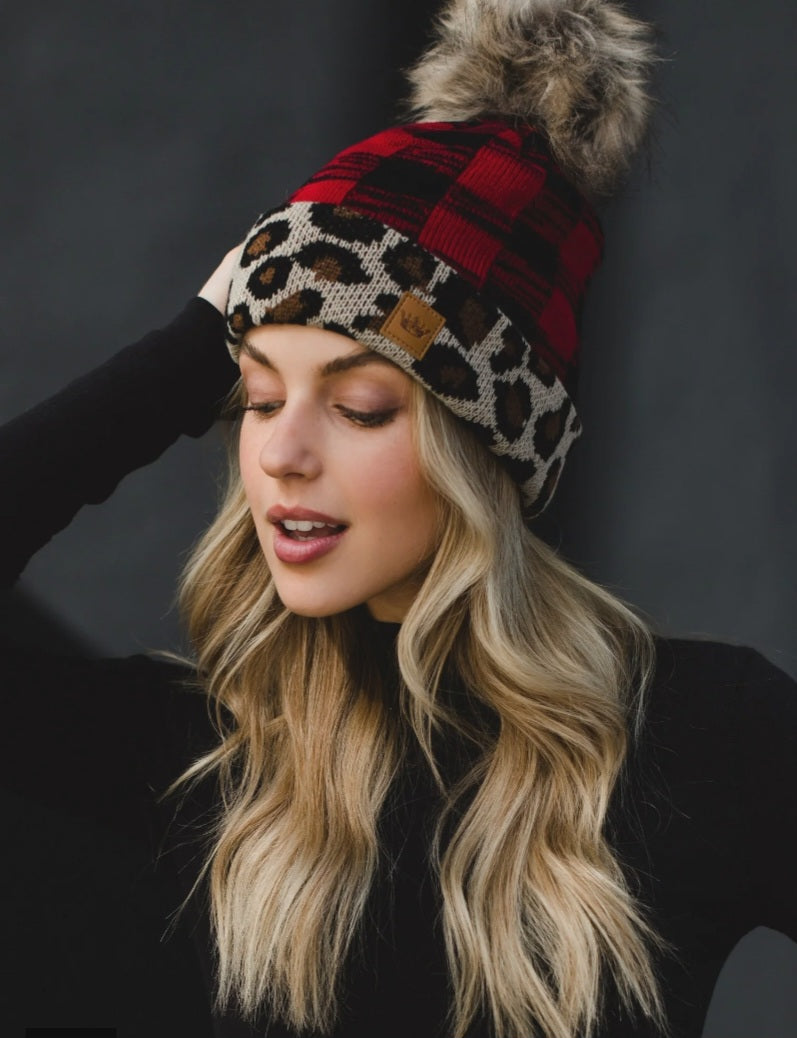 Buffalo Plaid & Leopard Print Pom detail Hat