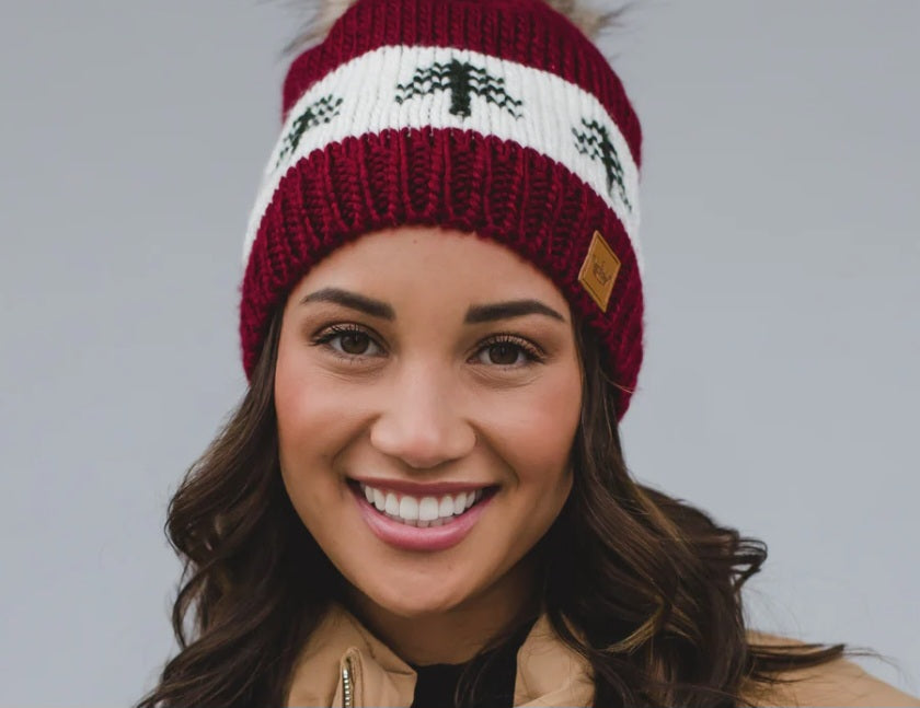 Deep Burgundy knit hat with winter white & evergreen tree pattern.