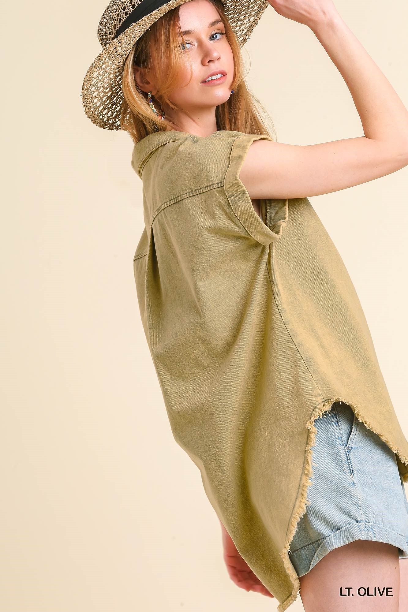 Denim Button Up Collared Short Sleeve Top with Chest Pocket and Frayed Hemline