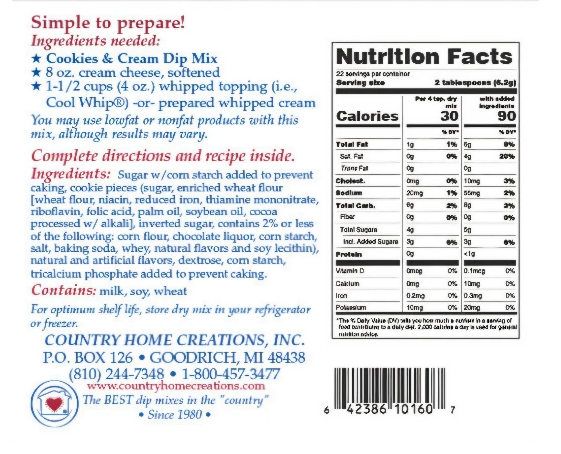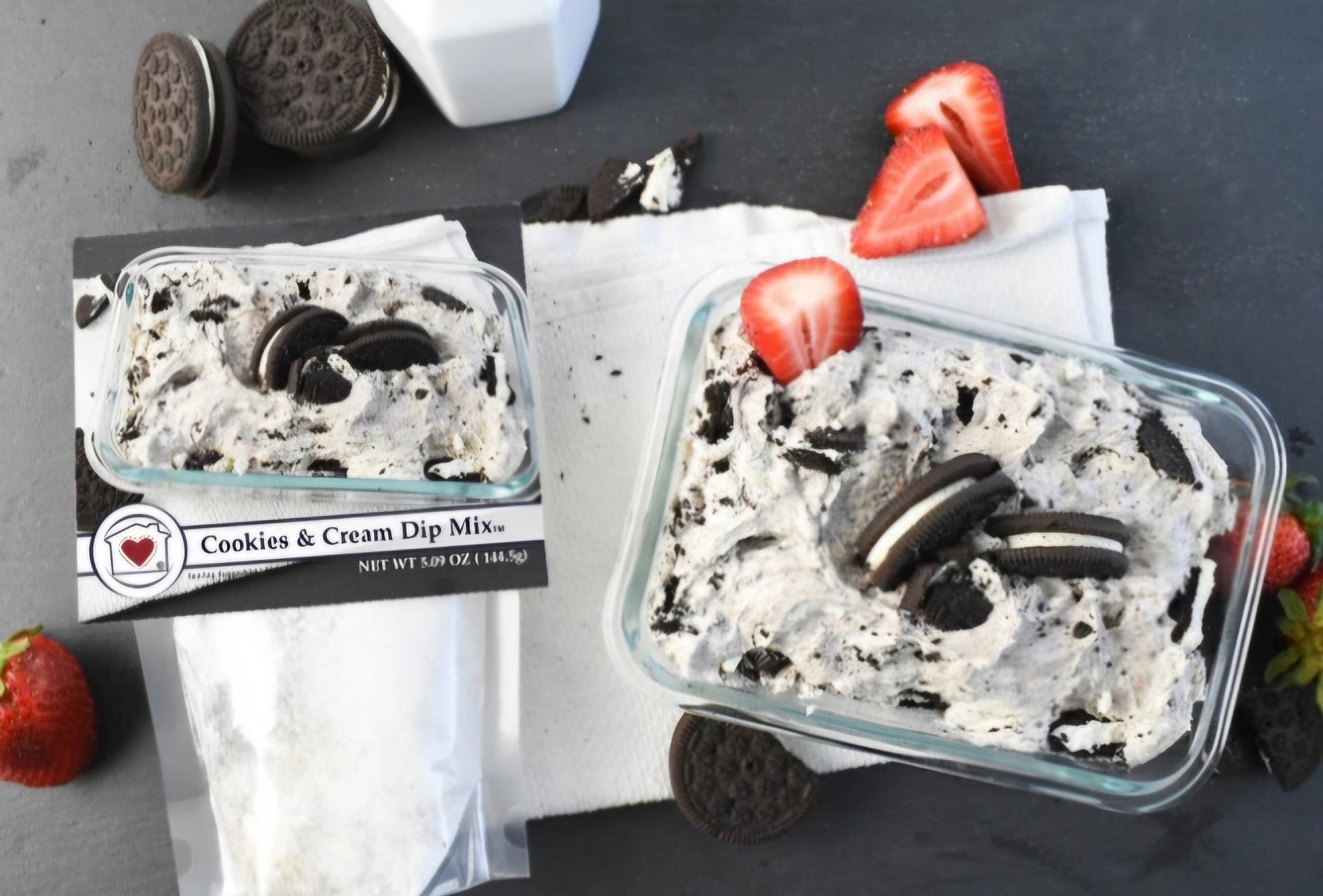 It doesn't get much better then this all time favorite combination! Dark chocolate cookie pieces combined with a vanilla sweet cream. Perfect served with fresh fruit, vanilla cookies, pretzel sticks (think sweet and salty) or on toasted bagels. Great recipe variation for a dessert cheeseball.
