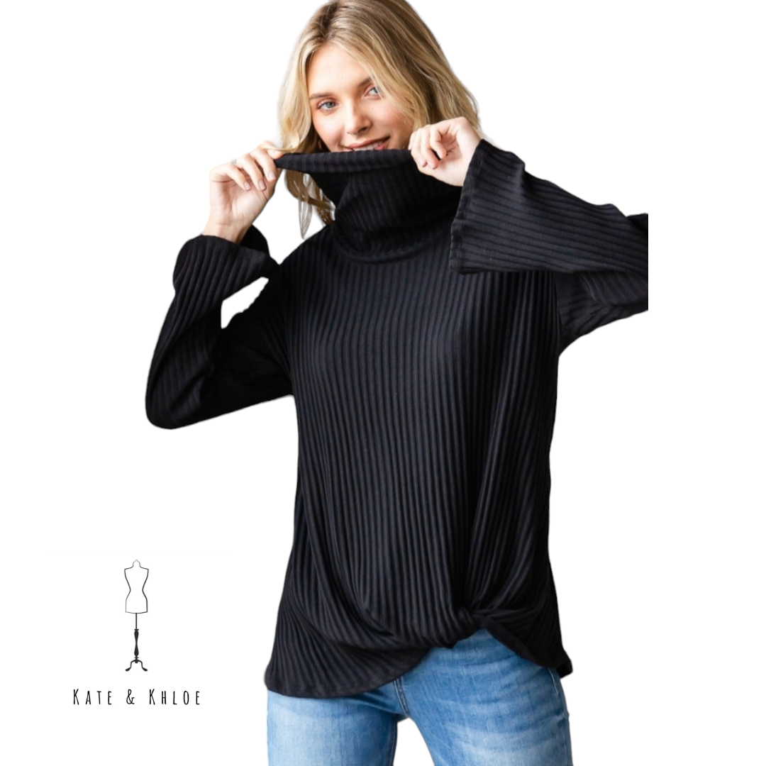 Introducing our exquisite black ribbed knit top, designed to wrap you in a cozy warmth and embrace your style with elegance. Crafted with meticulous attention to detail, this top features a loose cowlneck that adds a touch of effortless sophistication. The ribbed knit fabric not only provides a luxurious texture but also offers a snug, comforting fit. The twisted bottom hemline adds a unique and playful element, making this top a standout piece in your wardrobe. Whether you're enjoying a crisp winter day or cuddling up by the fireplace, this black ribbed knit top is the perfect companion, exuding a sense of warmth and charm that will envelop you in pure bliss.