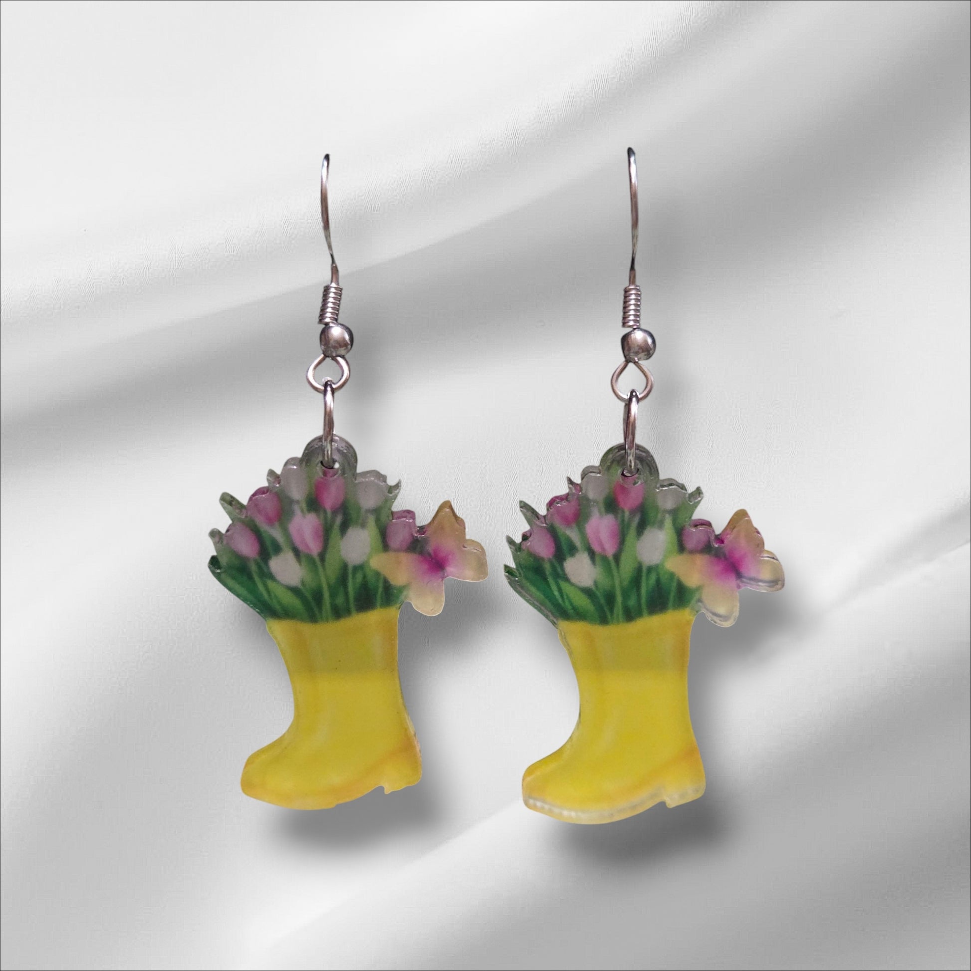 - **Playful Design:** Featuring cheerful yellow rain boots overflowing with colorful tulips, these earrings add a whimsical touch to any outfit, making them perfect for springtime celebrations or everyday wear!