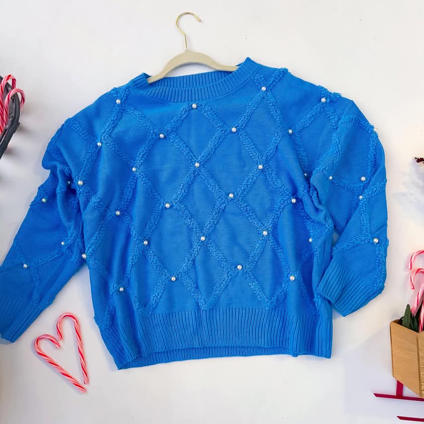 Wrap yourself in a hug of happiness with our Pearl-Perfect Blue Sweater! 💙✨ This isn't just a sweater; it's your new favorite companion for chilly adventures and cozy nights in. With a sprinkle of pearls and a dash of charm, this sweater is here to keep you stylishly snug.
