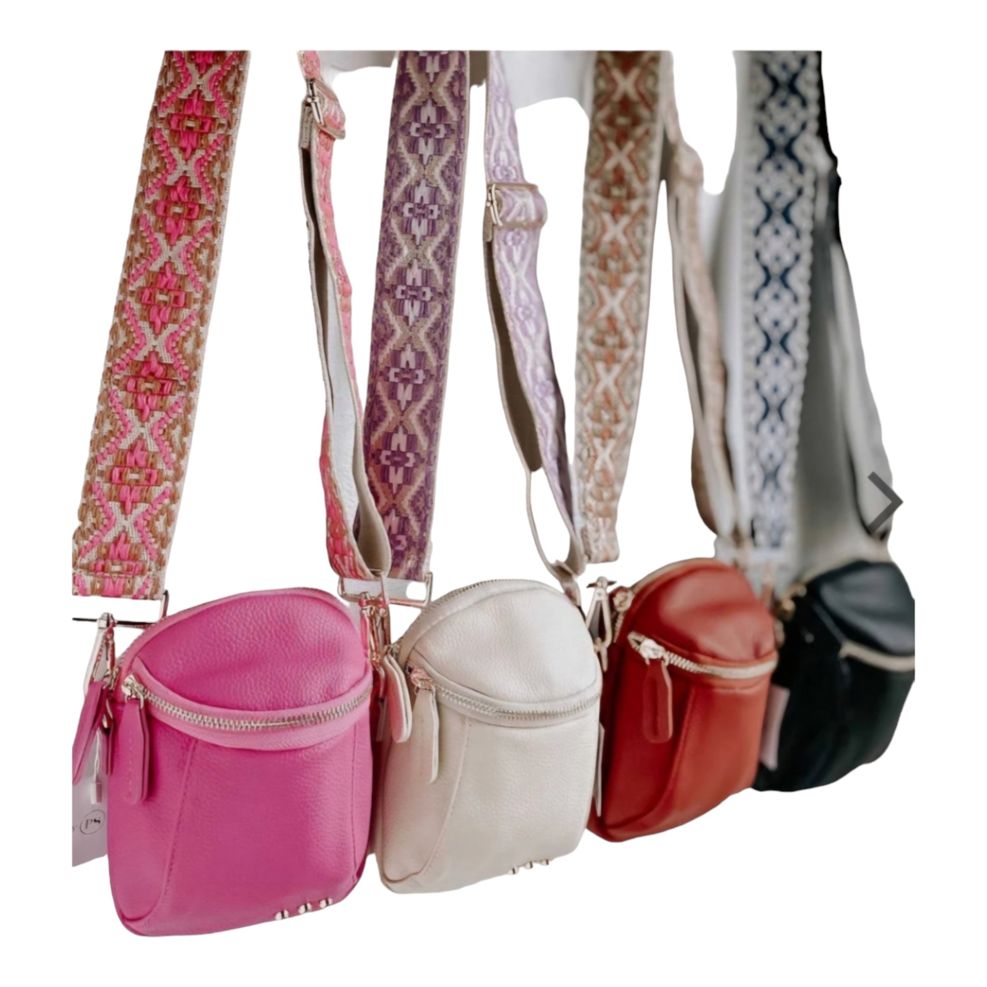 This Faux-leather crossbody bag is so soft and dreamy. Comes with a trendy and fun canvas strap and shiny gold classic hardware! The size is small enough that you'll forget you're wearing it but big enough to fit your phone, keys, and wallet! Featuring two outer zippered closures and a linen beige interior with a zippered slash pocket on the inside.