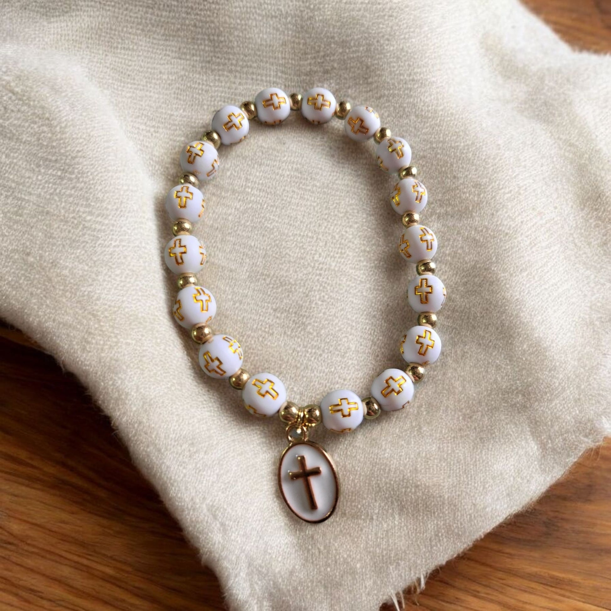 "Add a touch of heavenly beauty to your wrist with this Enamel Charm & Bead Stretch Bracelet! With its white bead and enamel charm embellished with gold crosses, you'll feel divinely stylish. Easy to wear with its stretch design, it's perfect for any occasion. Grace meets style."