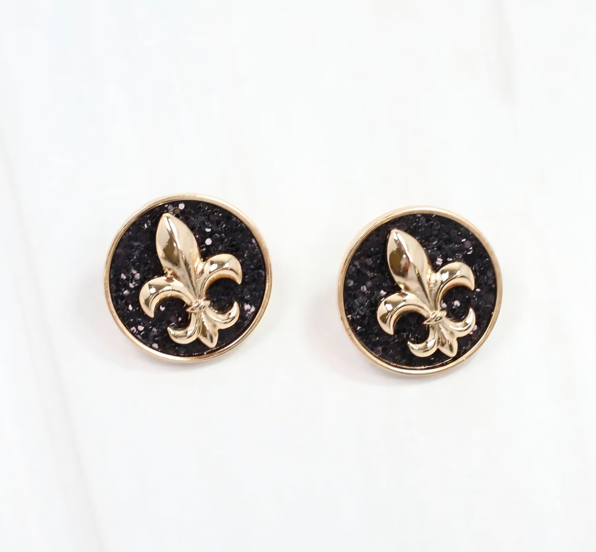 These playful Fleur de Lis earrings feature a black druzy stud topped with a shiny gold fleur de lis, adding a classic French flair to any outfit.