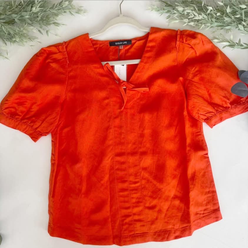The V-neckline with delicate tie detail adds a touch of femininity, while the button short sleeves provide a chic, tailored finish. This blouse is more than just a garment; it's a statement of confidence and grace.