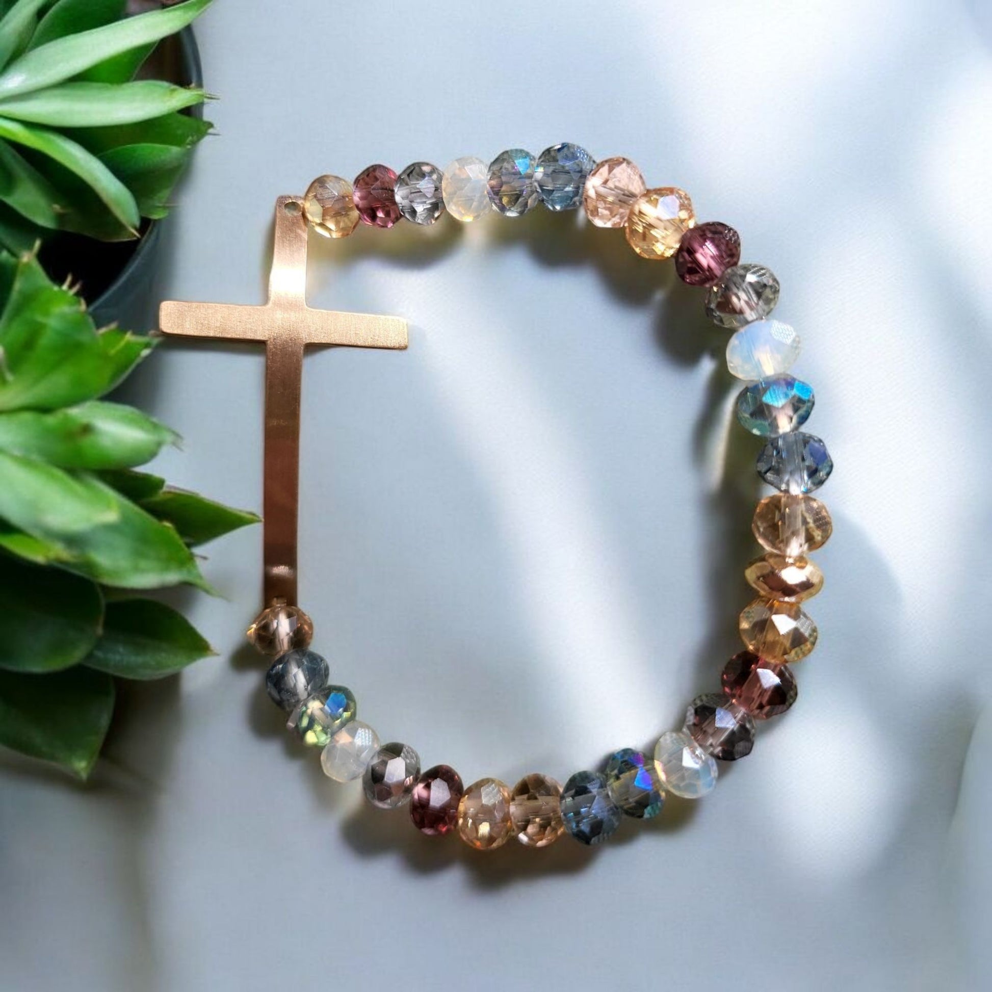 Add some divine style to your wrist with our Gold Cross & Glass Bead Stretch Bracelet. This gorgeous bracelet features delicate glass beads and a glimmering gold cross, creating a heavenly accessory for any outfit. Let your faith shine bright with this unique and playful wrist adornment.