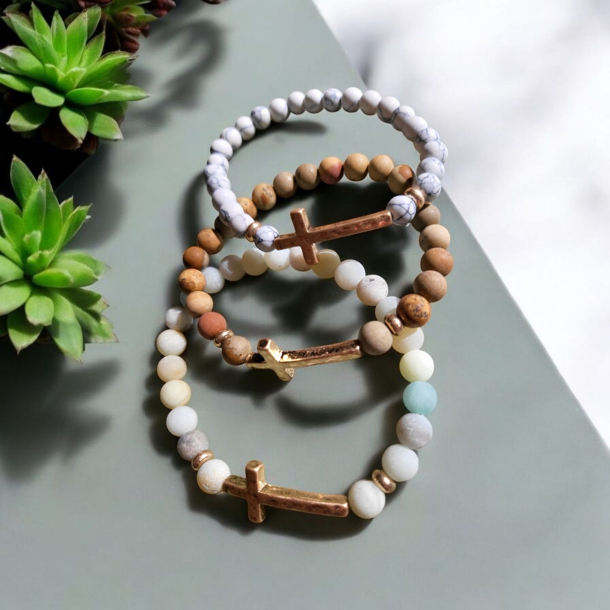 Get the perfect accessory for any outfit with our Hammered Gold Cross Stretch Bracelet! This stretchy bracelet comes in 3 stylish colors and features unique white & black, wood & tan, and light green beads. Don't miss out on this one-of-a-kind piece!