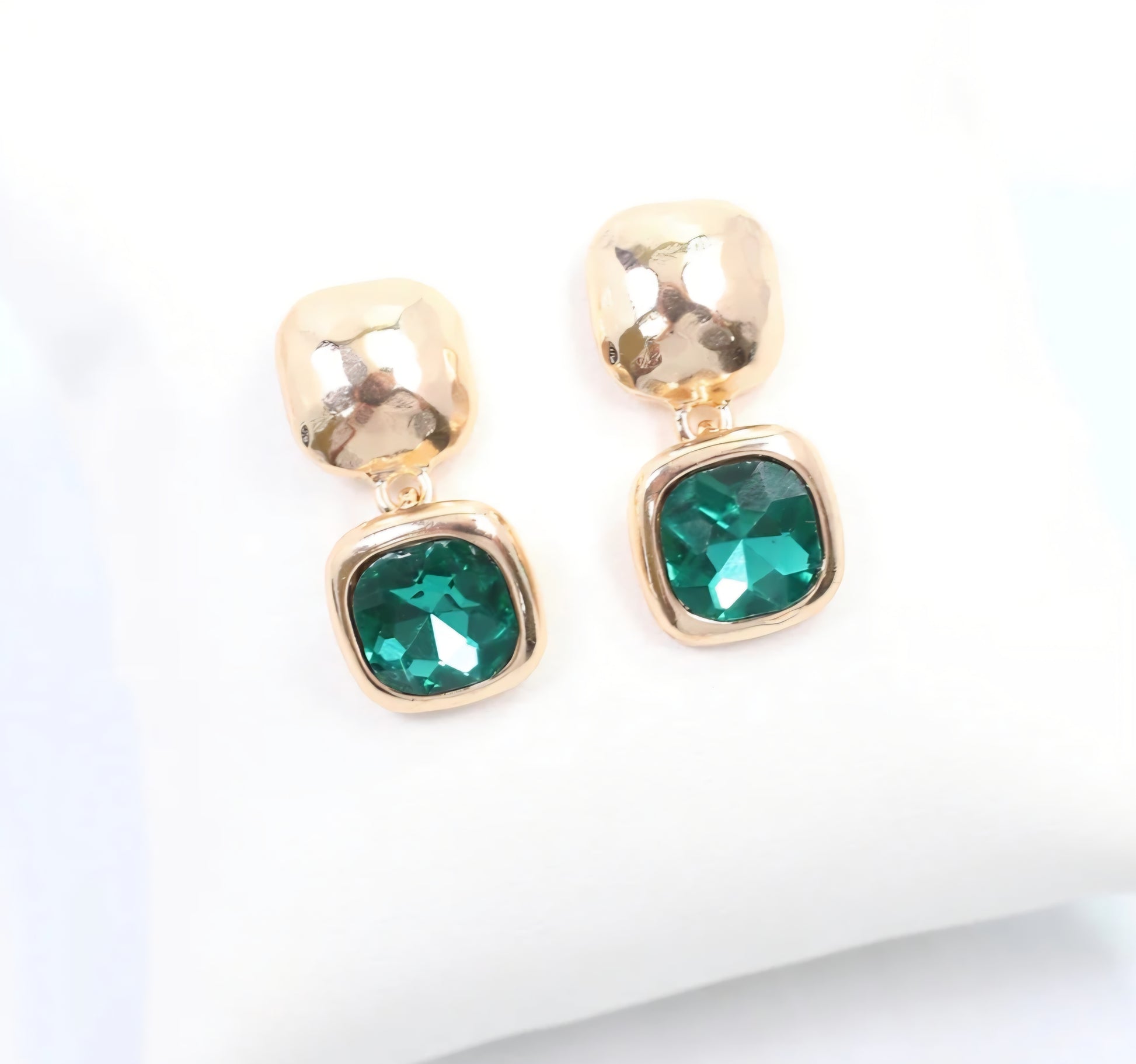 Dimensions: 1" longAdd a touch of elegance to any outfit with our Hawthorne Emerald and Gold Earrings. Featuring a hammered top and sparkling crystal drop in green, these earrings effortlessly elevate your look. Perfect for day or night, they add a subtle yet stylish shine to your ensemble. (Dimensions: 1" long)