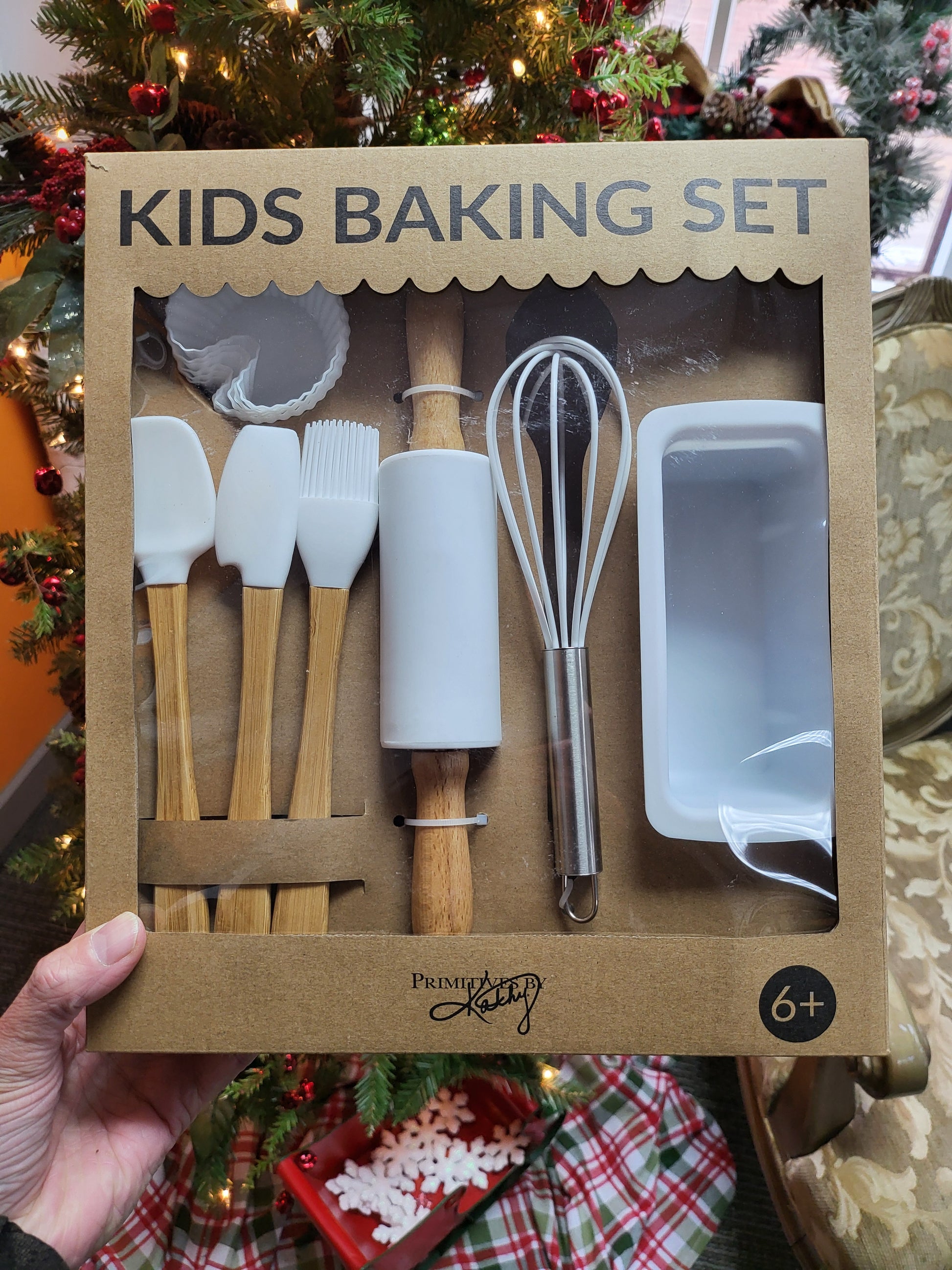 A baking set from our Christmas Collection featuring kid size baking items perfect for gifting or getting kids excited for holiday baking. Baking set holds 12 pieces including 6 silicone baking cups, 1 silicone bread mold, 1 whisk, as well as a silicone rolling pin, pastry brush, spatula, and spoon all with wooden handles. Hand-wash recommended; do not microwave. Our Kid's First Baking Set comes packaged in a cardboard box with each item secured and displayed in acrylic window for easy shelf display and gifting. A fun set of baking accessories perfect for the holidays and year round. Recommended for ages 6+.