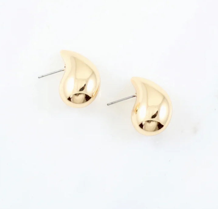 This teardrop shaped metal earring is so on trend! It has a shiny metal finish and is on a post back. Pairs perfectly with just about any outfit!