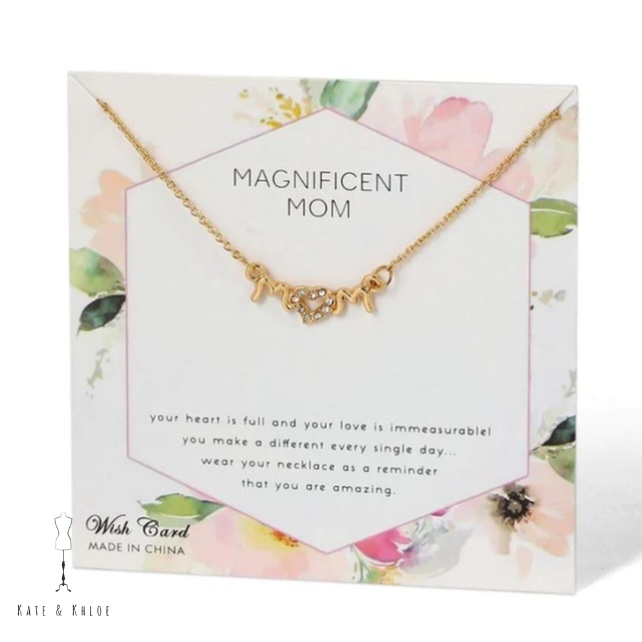 Gold Mom necklace on sentiment card.