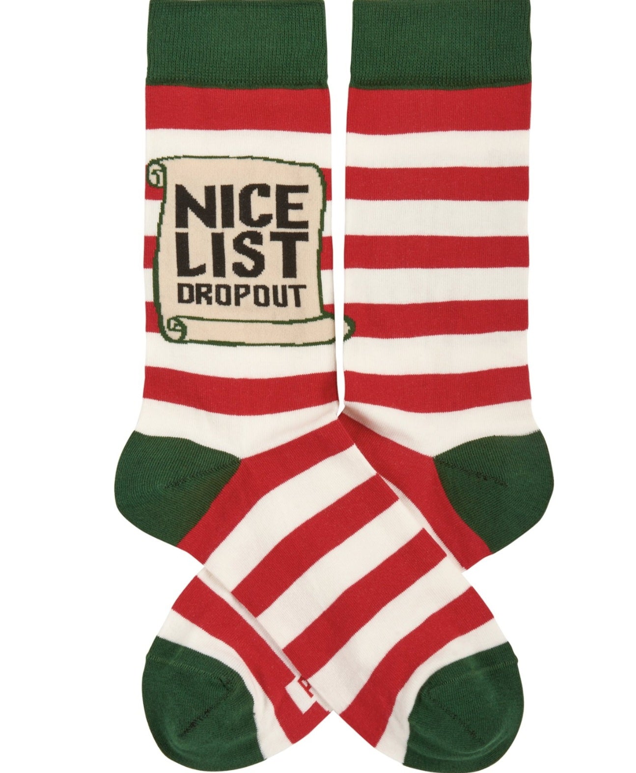 A pair of colorful woven socks from our Christmas Collection displaying a unique hand illustrated paper list design on red and white stripes with humorous sentiment that reads "Nice List Dropout." Socks feature a one size fits most design made with cotton, nylon, and spandex. Our Nice List Dropout socks come with a header card and a clear plastic hanger for display. A fun seasonal accessory perfect for self-expression or for gifting.