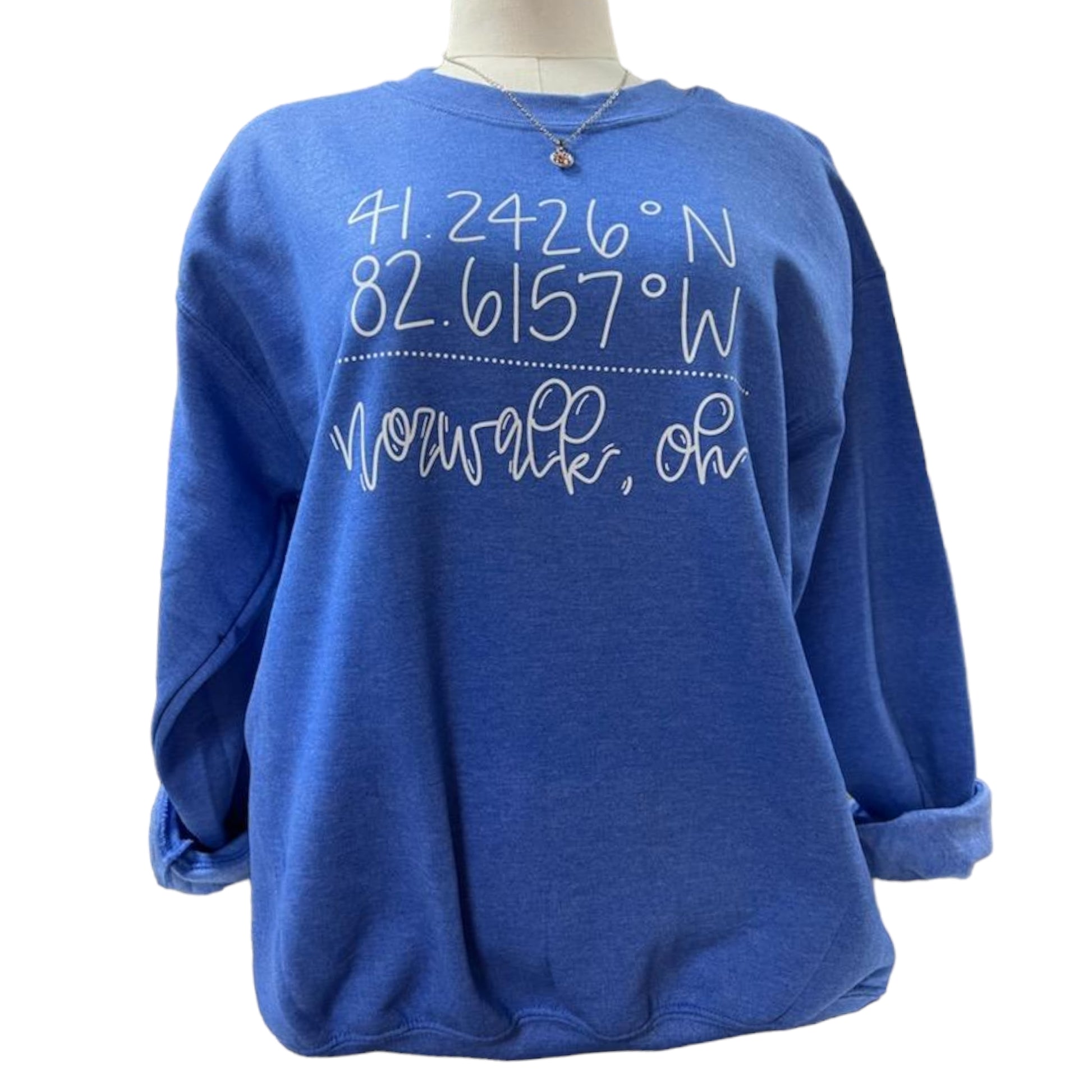 Heathered Blue Screen print sweatshirt Norwalk Ohio wirh longitude & latitude printed in white.