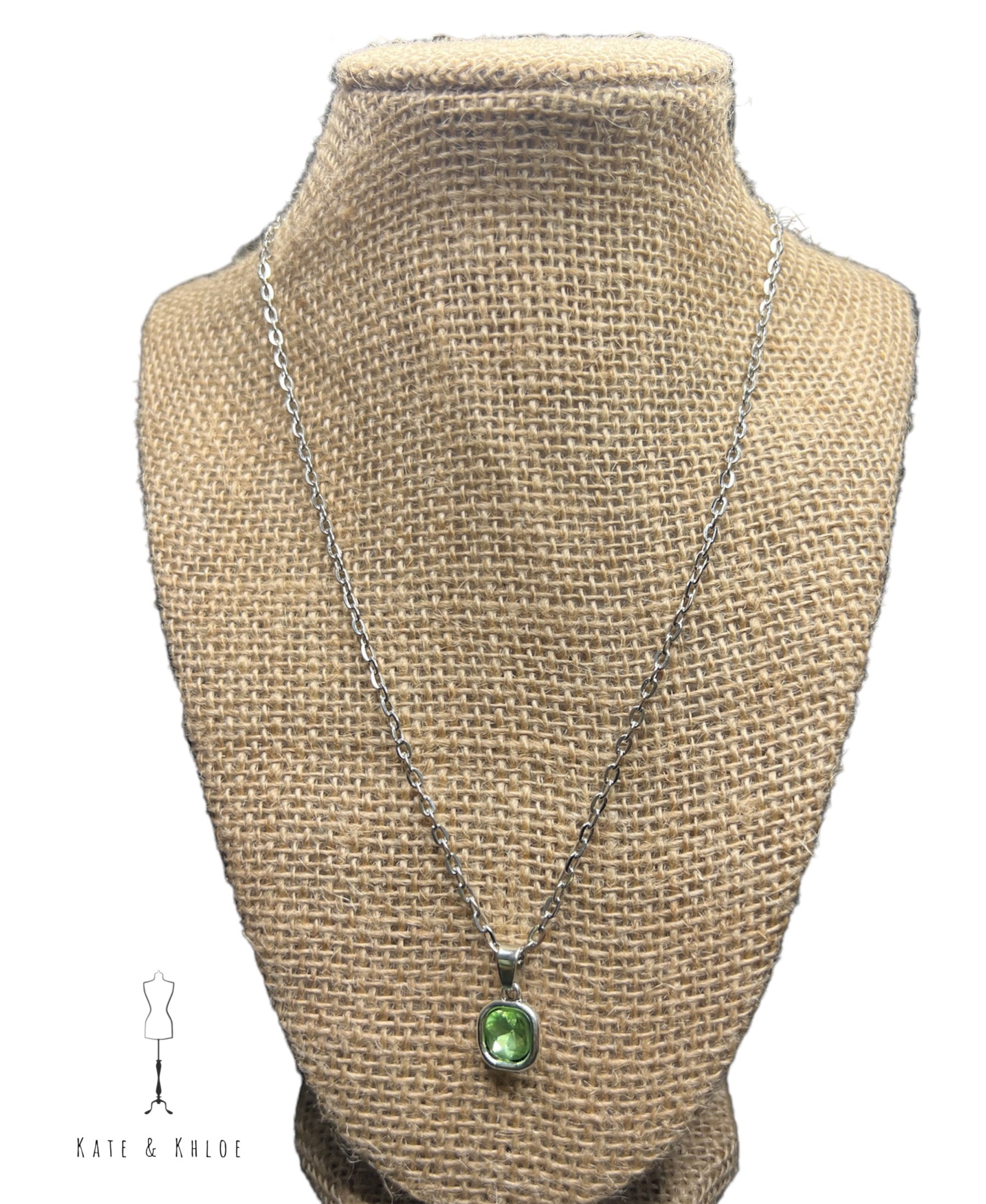 This silver necklace is lightly adjustable in the back. The peridot green is perfect for that flash of color needed to perk up any outfit!