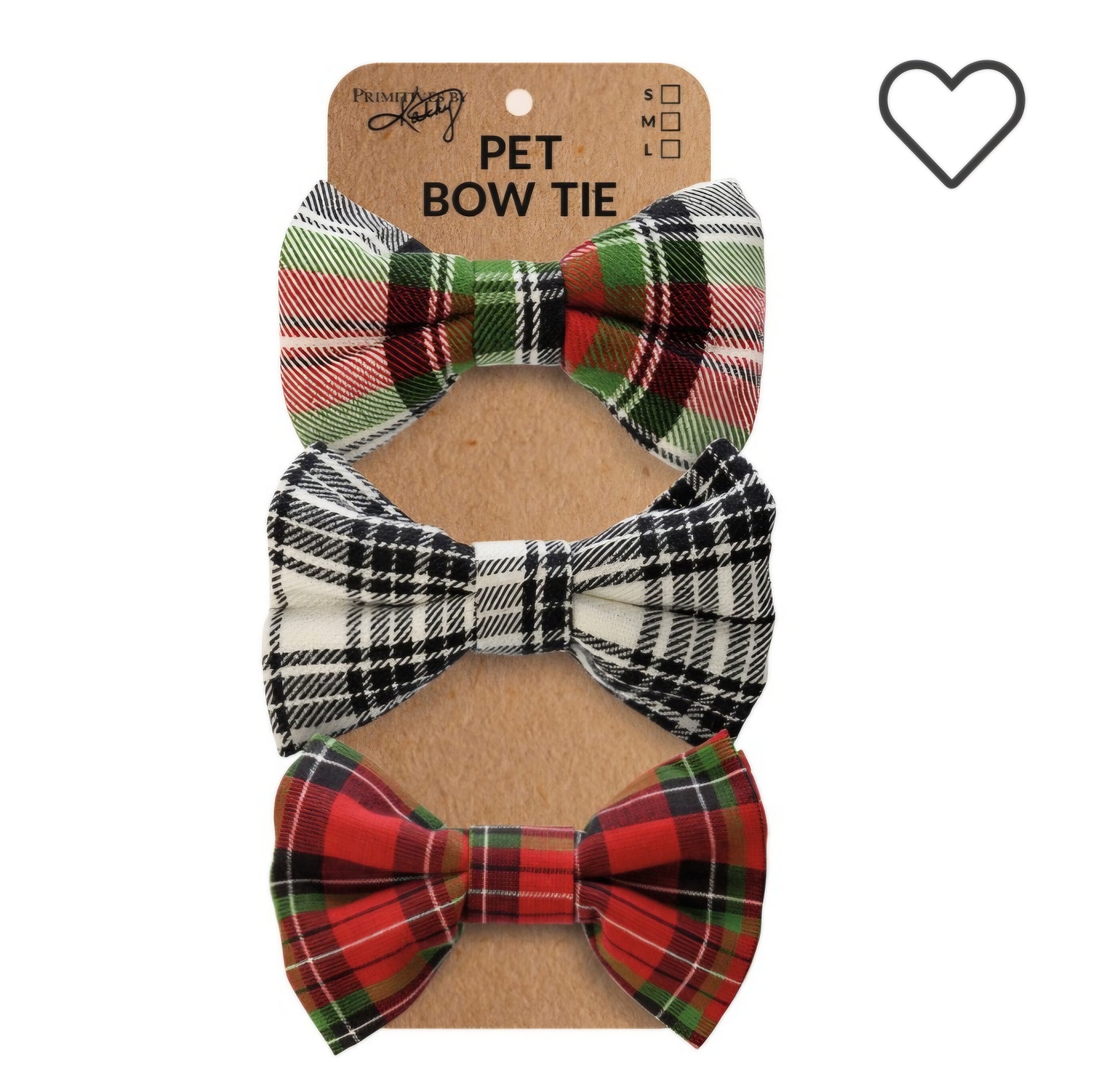 A set of three pet bow ties featuring Christmas plaid designs. Each bow tie is made of soft cotton and easily attaches to a collar using a single velcro loop. Bow ties come attached to a kraft paper card with a keyhole to easily display on rack. Hand wash only. Pet bow ties coordinate well with complementing people scarves and pet bandanas so pet parents and their fur babies can have a sweet matching moment.