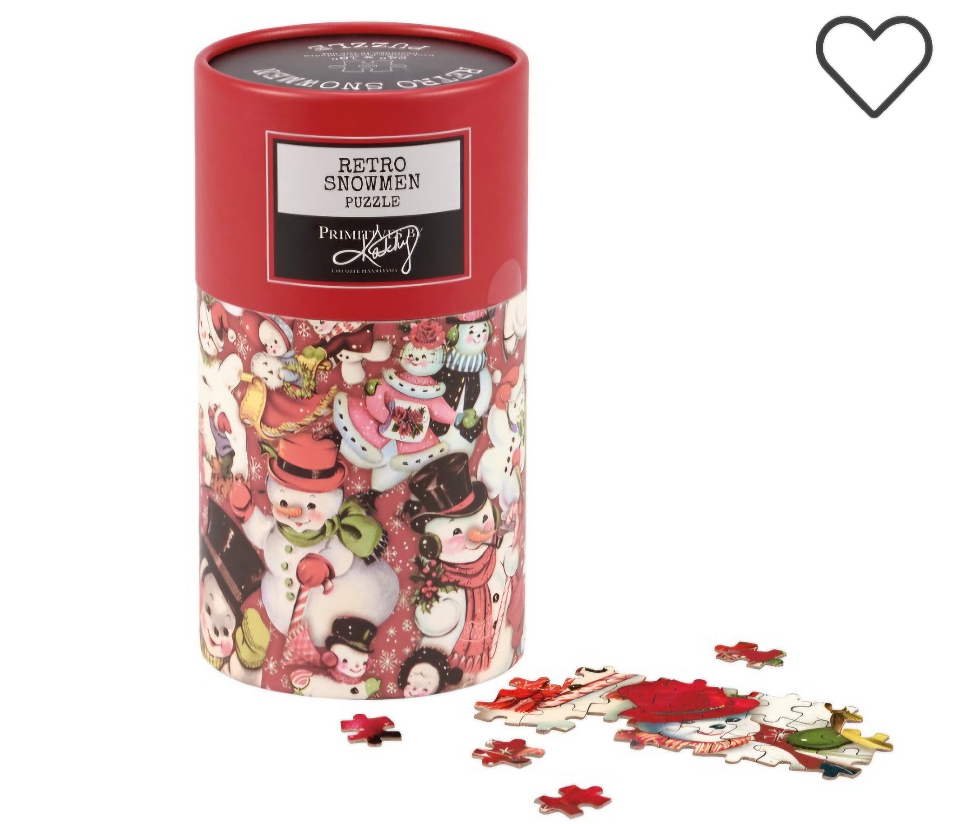 A 500 piece puzzle from our Christmas Collection displaying a collage of vintage jolly snowmen art. Puzzle pieces are packaged in a resealable plastic bag and enclosed in a cylindrical box with the design displayed around outside and a descriptive "Snowy Friends Puzzle" sentiment on lid. Our Snowy Friends puzzle includes an 10 inch x 8 inch printout of full puzzle image for reference. Contains small parts; this is not a toy. A charming accessory great for seasonal gifting.