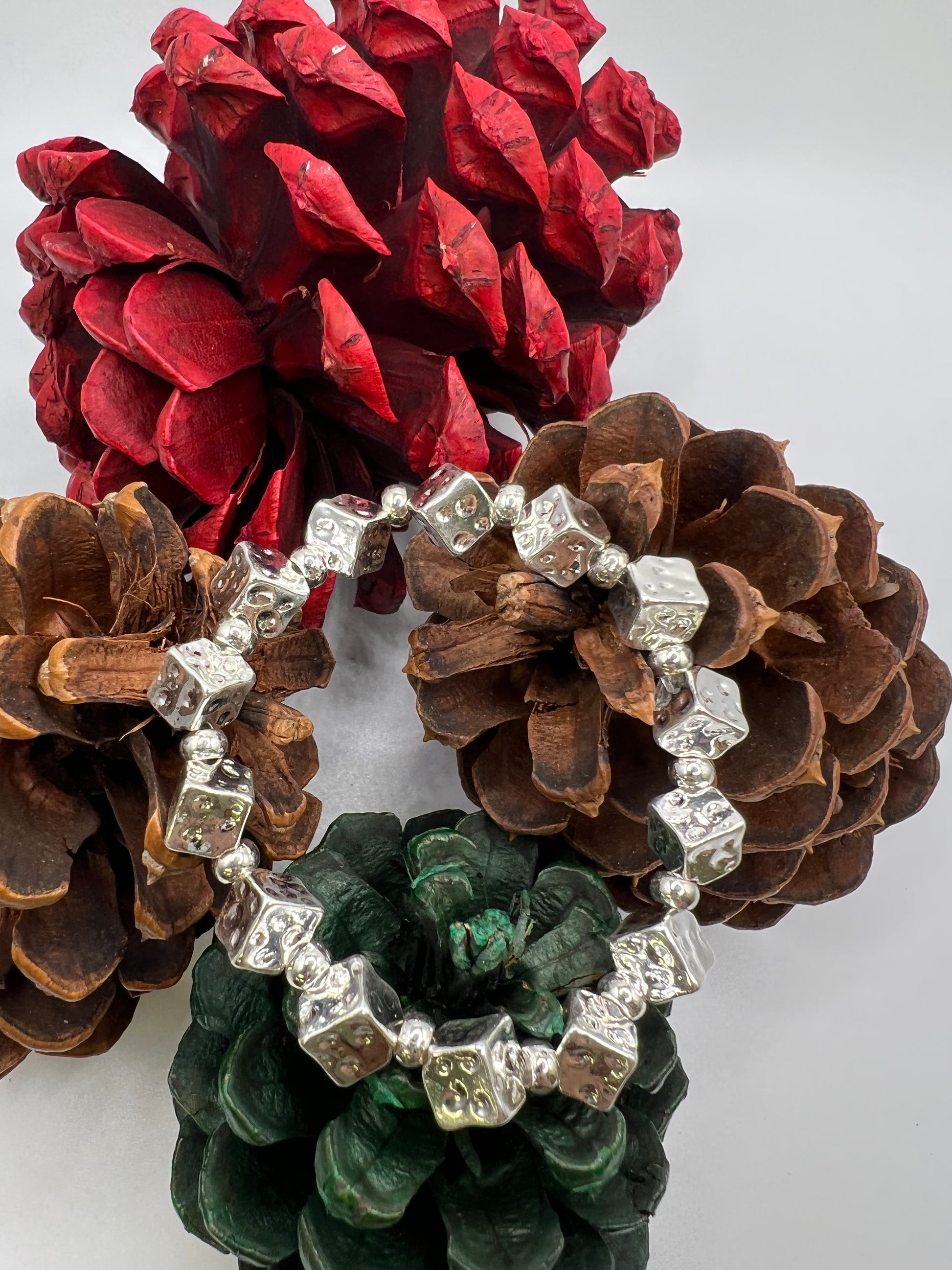 This stretchy silver cube bracelet has some nice weight to it! It’s hammered cube give it an antique look you’re sure to love!