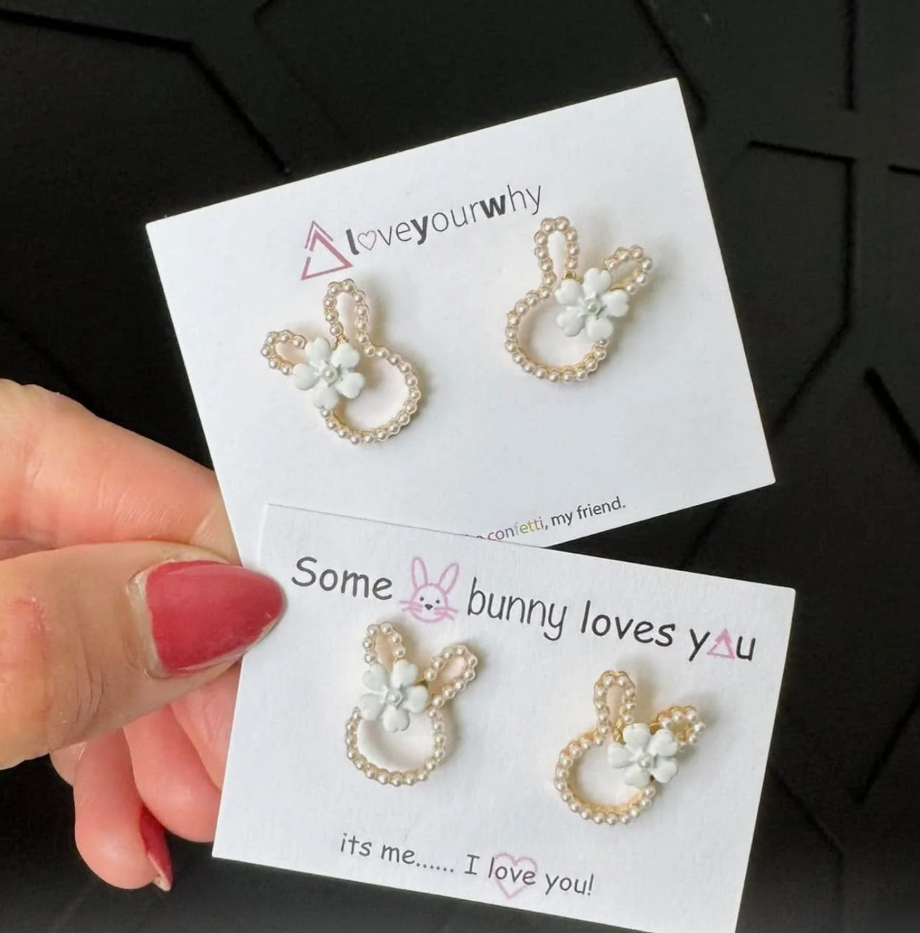 Hop into style with our Some Bunny Loves You Earrings! These unique pearl and gold stud earrings are shaped like petite flowers with a playful bunny twist. Hypoallergenic for comfortable wear, these earrings are perfect for adding a fun and quirky touch to any outfit.