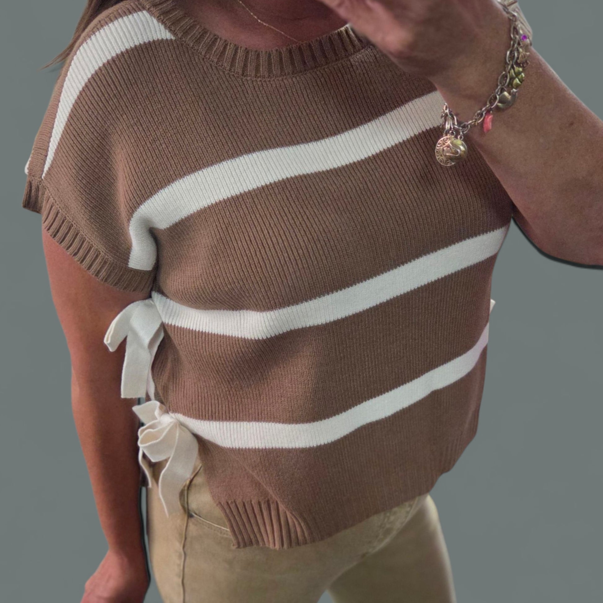 Fall sweaters, women's fashion, layering sweaters, brown and cream stripes, cozy knit pullover, stylish side tie, relaxed fit sweater.
