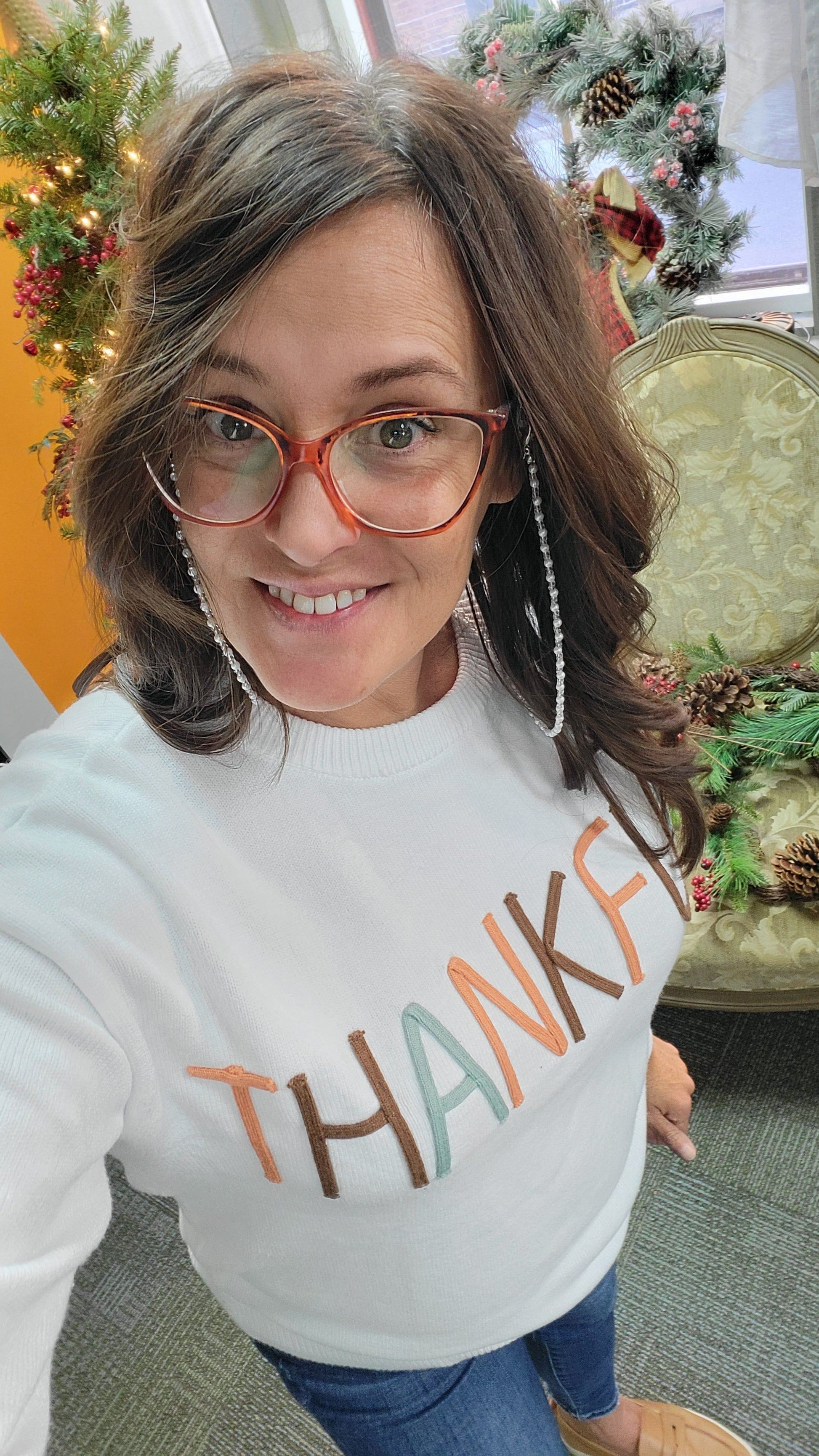 Embroidered Thankful Sweater. Luxe soft cashmere feel.