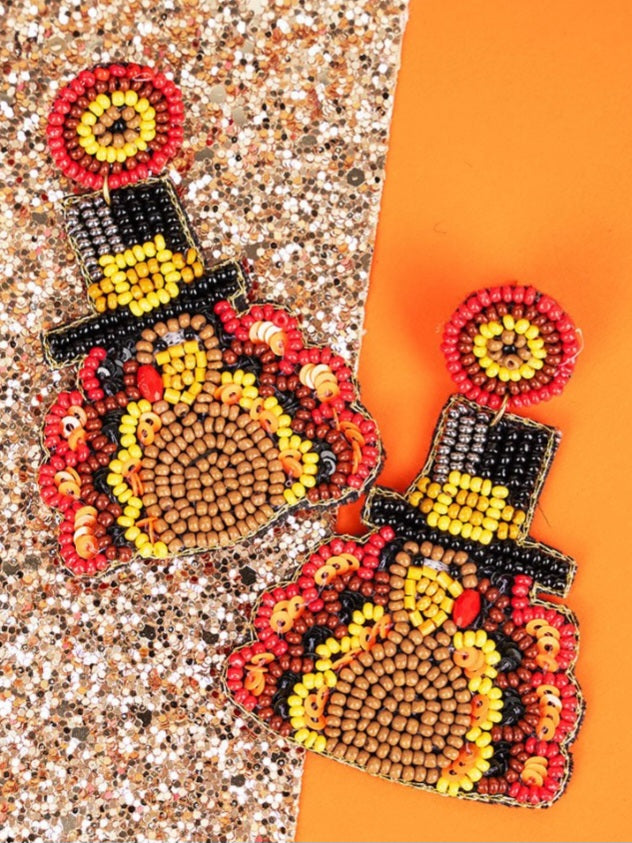 Each earring is meticulously handcrafted, showcasing a charming turkey shape made of intricately woven seed beads. The rich, earthy tones beautifully capture the warmth and essence of the Thanksgiving season, making these earrings a standout piece.