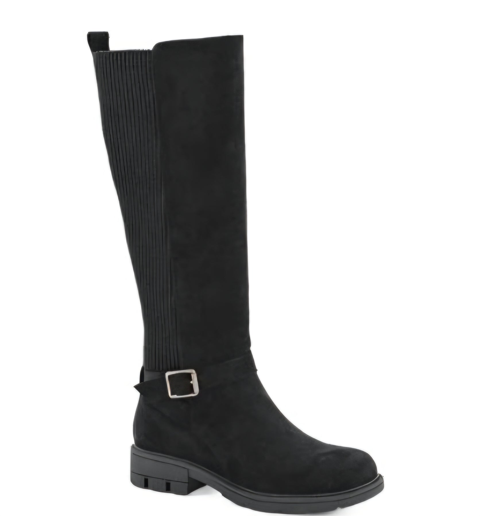Fall’s must-have boot has arrived! This stunning tall black beauty boasts a ribbed stretch back panel for a comfy and flattering fit, plus a classic buckle detail that adds just the right touch of charm. Whether you’re pairing it with your favorite skinnies or a cozy sweater dress, this boot is ready for pumpkin patches, crisp strolls, and those delightful coffee runs.