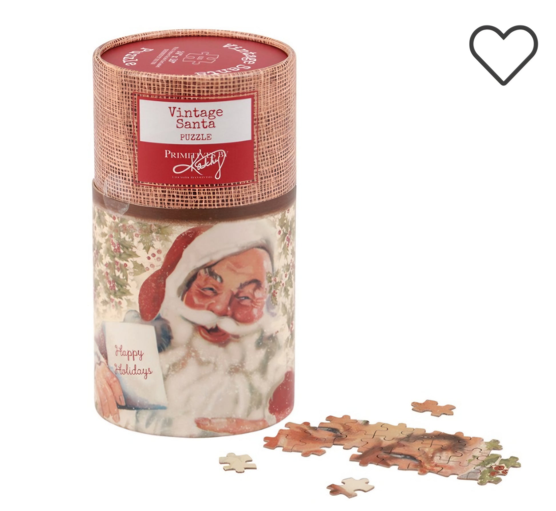 A 500 piece puzzle from our Christmas Collection displaying vintage art of a jolly Santa holding a "Happy Holidays" card. Puzzle pieces are packaged in a resealable plastic bag and enclosed in a cylindrical box with the design displayed around outside and a descriptive "Vintage Christmas Puzzle" sentiment on lid. Our Vintage Santa puzzle includes an 10 inch x 8 inch printout of full puzzle image for reference. Contains small parts; this is not a toy. A charming accessory great for seasonal gifting.