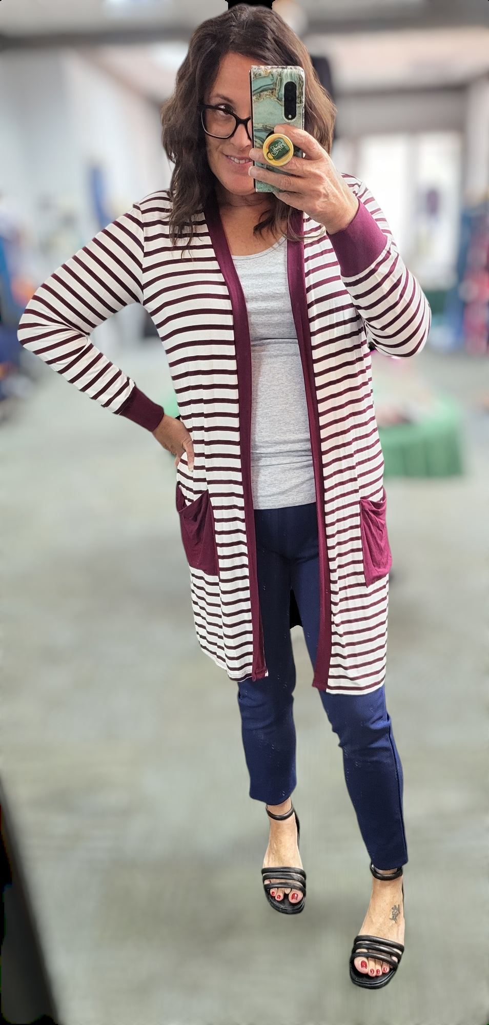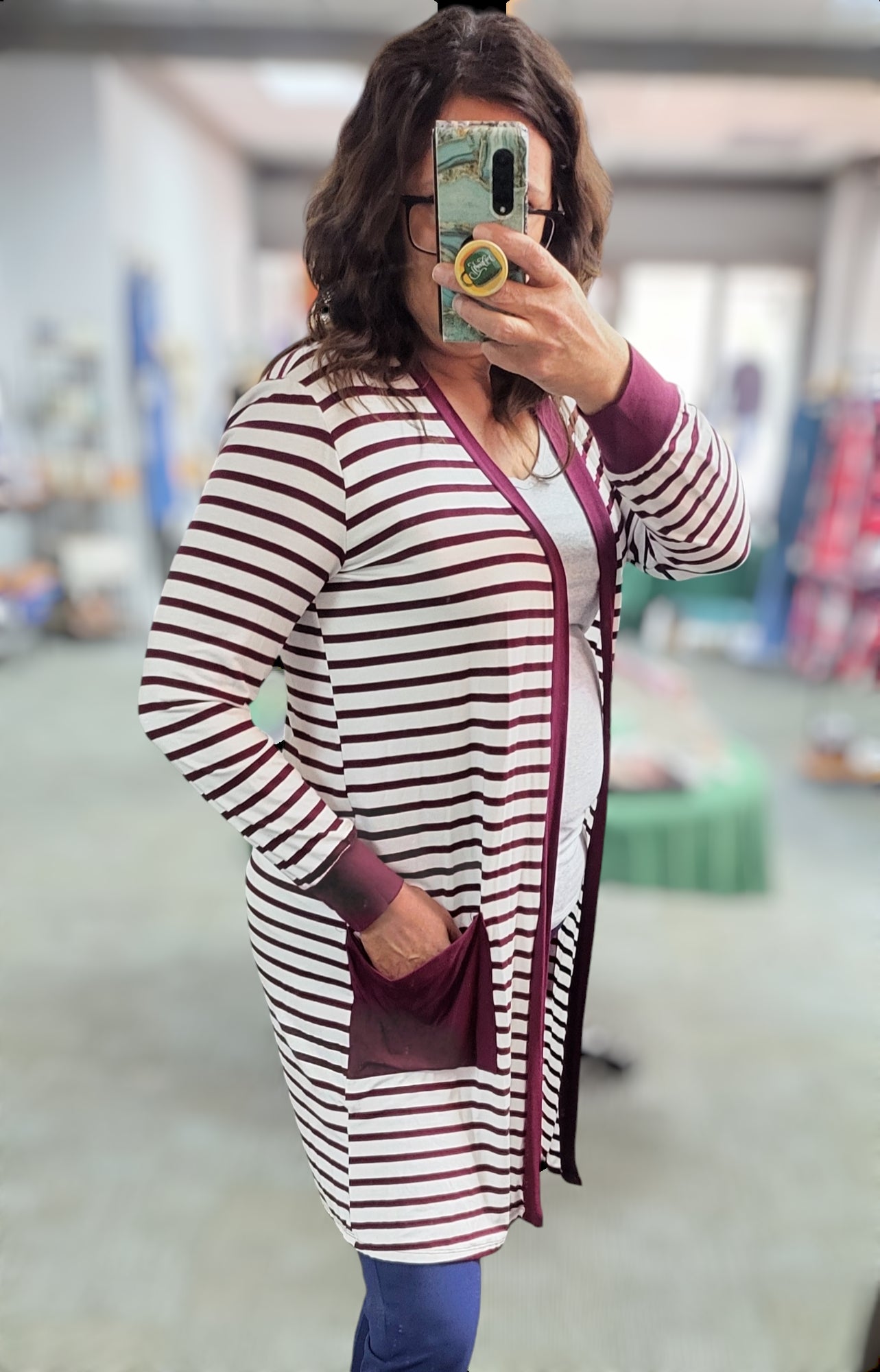 This cardigan will be exactly What you love! The stripe print creates the perfect dimensions and the cozy soft knit will keep you wrapped in cozy. We really feel like this cardigan will be your go-to favorite. Cardigan features long length, pockets, cozy soft knit feel & striped pattern.